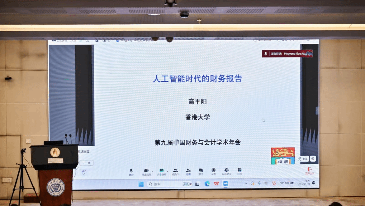 香港大学高平阳教授以线上方式作了题为《Financial Reporting in an AI World》的演讲。他指出人工智能正深刻改变财务报告的信息来源、处理方式、披露频率与形式,重塑其本质与核算逻辑。他强调,学界需重新思考AI环境下会计准则的制定,并确保AI生成或辅助生成财务信息的可靠性、相关性及可审计性,为财务报告理论的数智化转型提供前瞻性指引。